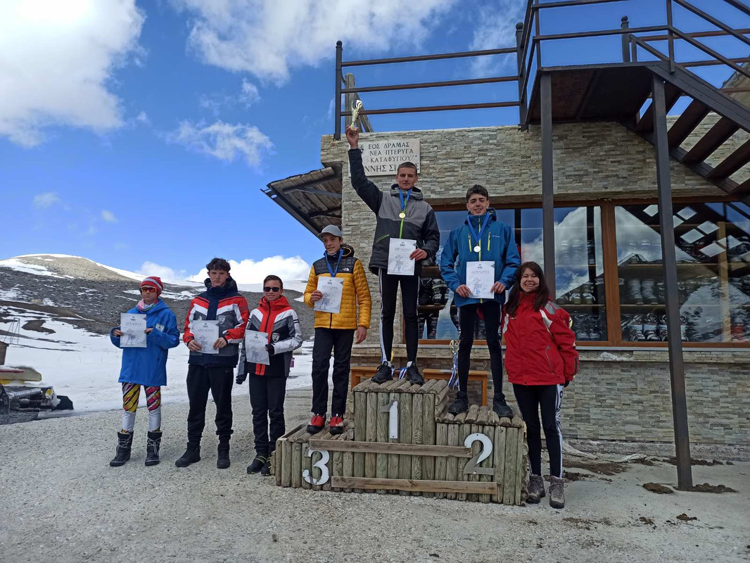 Οι αθλητές του ΑΟΦ Χριστίνα Ρόζα και ο Ευάγγελος Αθανασίου, στο ψηλότερο σκαλί του βάθρου στο Πανελλήνιο πρωτάθλημα Διάθλου 2022.